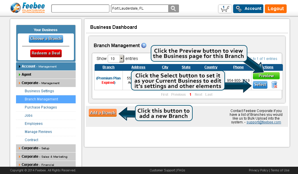 Feebee gives you the ability to easily manage your Business, even if your Business is a Corporation. With the Business dashboard, you can add Branches to your Business Account. These Businesses can be created from your Business Dashboard, and then you can select that Branch to further customize it until you're ready to upgrade that Branch.